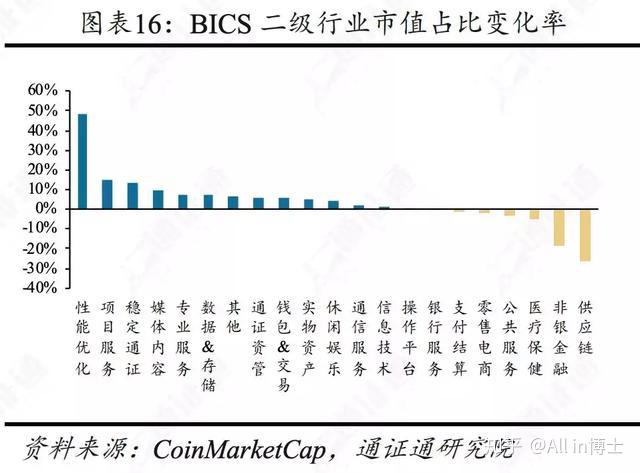 在市值排名前五位的BICS(Blockchain Industry Classification Standard,区块链行业分类标准)二级行业中,支付结算行业市值有所降低,从76.4%降至75.8%。从市值占比变化率看,性能优化、项目服务、稳定通证行业市值占比增速较高,相比上周分别增长了48.2%、14.9%和13.6%;供应链、非银金融、医疗保健市值占比下降较为明显,较上周分别下降了26.4%、18.3%和4.8%。