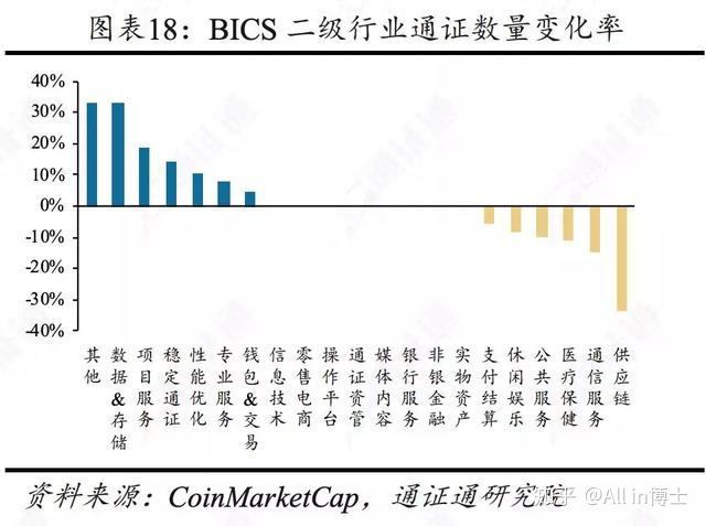 本周通证数量增长较为明显的BICS二级行业为项目服务,相比上周增加3个,稳定通证、数据存储等行业增加2个;通证数量下降较为明显的BICS二级行业分别为支付结算、休闲娱乐和通信服务,相比上周分别下降了5个、3个、3个。