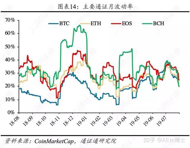 根据历史数据研判,目前的震荡整理趋势接近尾声。目前BTC月波动率再次回落到20%以下,成交量持续回落,价格回归9000美元支撑位上方,表明中期整理可能在未来两周内结束,结合9月Bakkt期货正式上线等事件,BTC很可能在9月初突破压力位继续走牛。