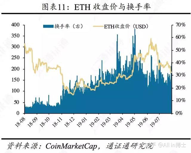 BTC现价10374.3美元,周跌幅为12.5%,月涨幅为7.0%。本周BTC日均成交量为182亿美元,日均换手率为9.5%。BTC本周反弹遇阻回落,将在9500~10500美元位置震荡盘整。