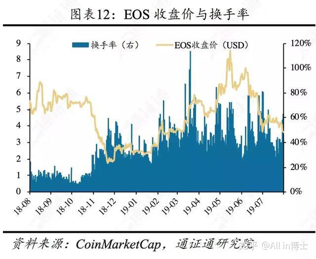 EOS现价3.59美元,周跌幅为8.1%,月跌幅为6.6%。本周EOS日均成交量为16.3亿美元,日均换手率45.6%。EOS跌幅略小于BTC、ETH,但交易活跃程度下降,且已经接近前期低点3.3美元。