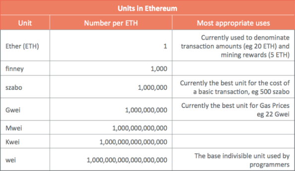 最小的单位是wei ,每个ETH有1,000,000,000,000,000,000wei 。还有一些中间单位:Finney, Szabo, Shannon, Babbage, Ada--全部以对加密货币或网络相关领域作出杰出贡献者命名。